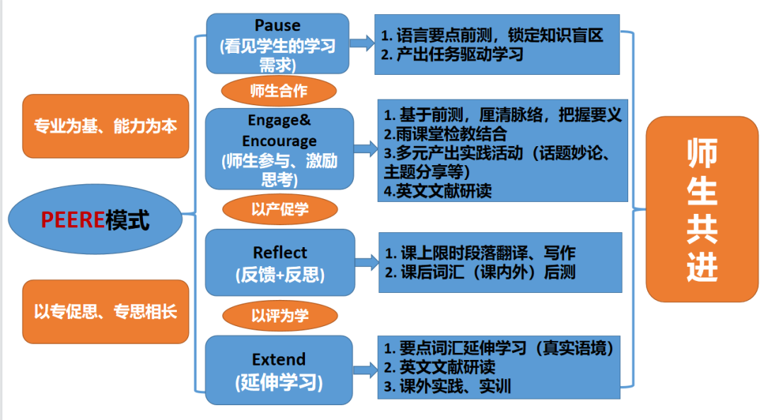 王晓梅老师长期承担英语专业高年级核心课程《高级英语(一)》和《高级英语(二)》的教学。她以这些课程为依托,秉持“专业为基、能力为本、育人为魂”的教学理念,结合产出导向法(POA)的四大理念——“学习中心”“学用一体”“文化交流”“关键能力”,创新构建了PEERE教学模式,致力于实现“以专促思、专思相长、师生共进”的教育目标。