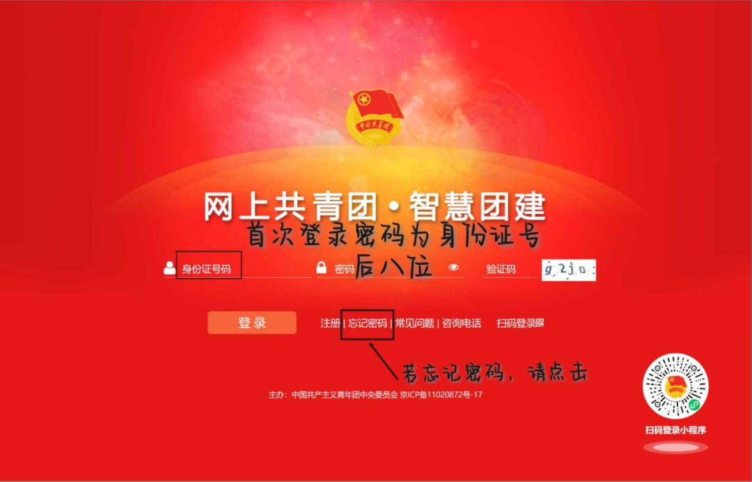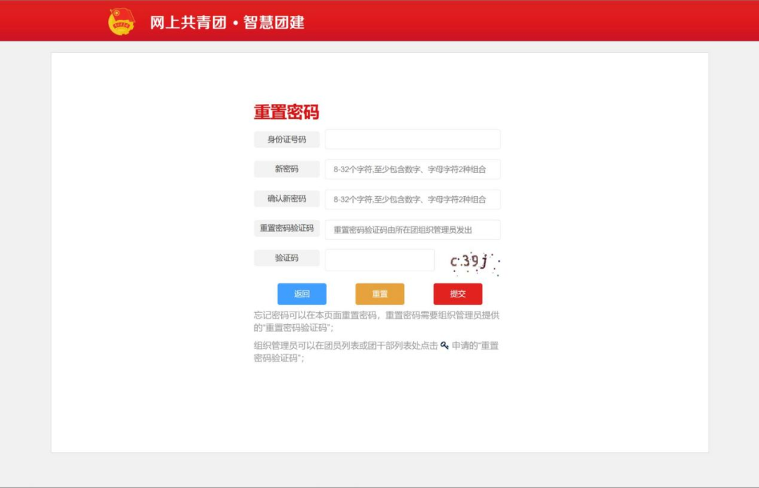 首次登录会提示修改密码。若遗忘密码:在登录页面点击「忘记密码」,并联系原团支部管理员生成「重置密码验证码」,随后填写下图内容提交,即可重新找回密码。