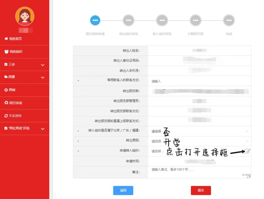 查看个人资料是否有需要补充完善的项目,重点查看核对手机号码、职业、团员编号等内容是否需要更新。修改后请先联系当前所在团支部审核,审核通过后再发起组织关系转接。