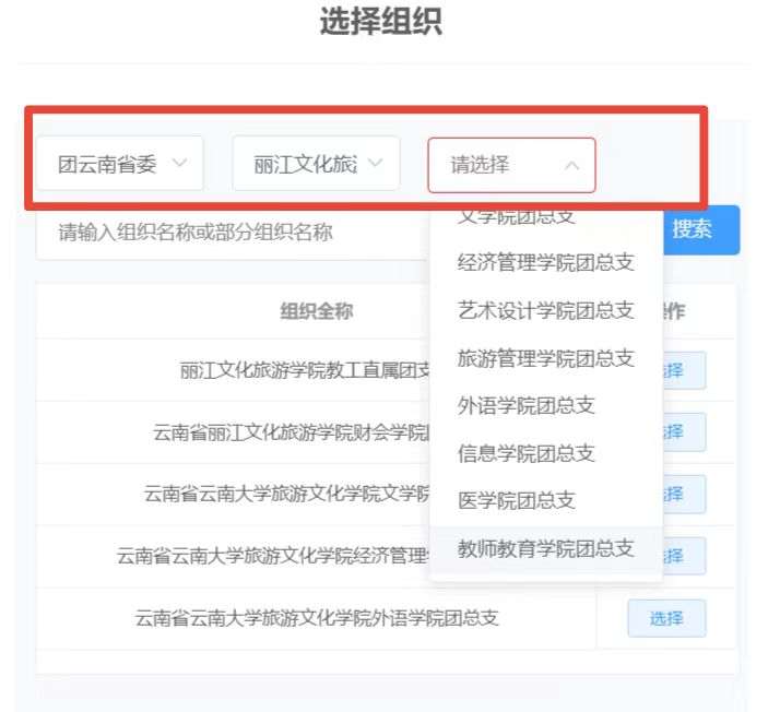 申请转入组织请依次选择【团云南省委】→【丽江文化旅游学院团委】→【所属二级学院团总支】