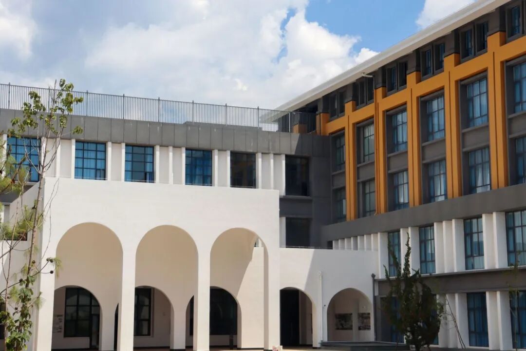 大礼堂位于校园南北区之间的交汇点,礼堂以独特的青穹顶与素雅墙体,在朝霞夕照间静立成画。它与远山晴空默契对望,既有学府的庄重感,也流露着自然的诗意。