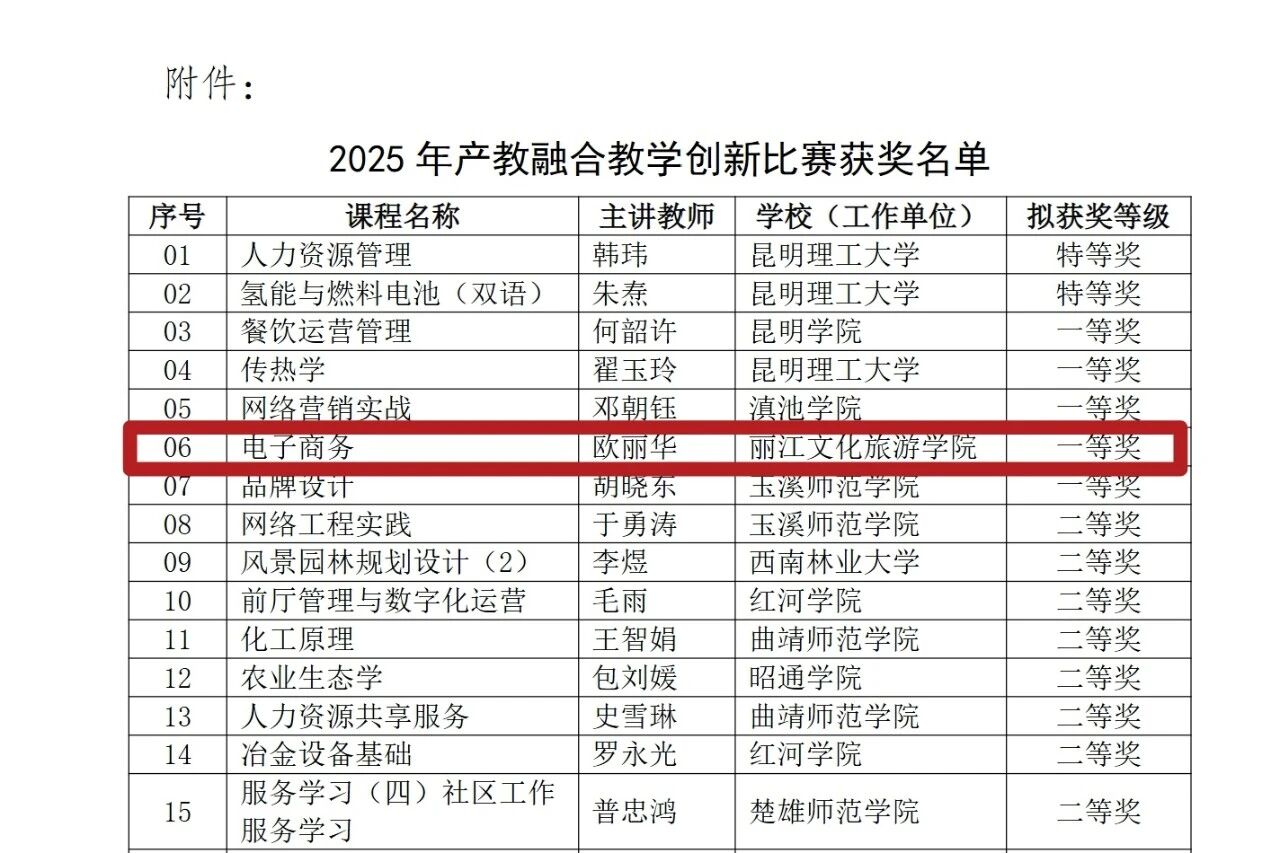 近日,由云南省教育厅指导、云南高校产教融合发展联盟主办、昆明学院承办的“2025年产教融合教学创新比赛”圆满落幕。我校教务处欧丽华老师团队凭借特色课程《电子商务》在激烈角逐中脱颖而出,荣获一等奖;同时,我校凭借出色的赛事组织与优异的参赛成绩,荣获“优秀组织奖”(全省仅8所高校获此殊荣)。