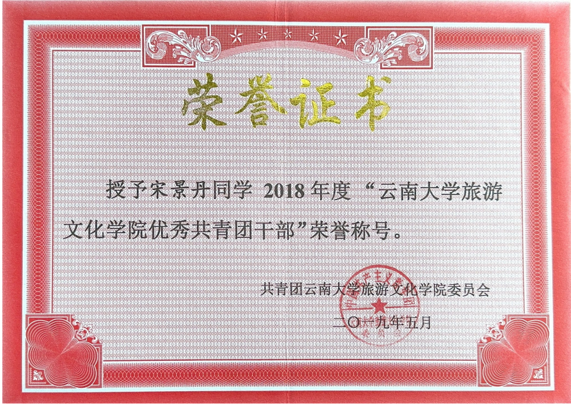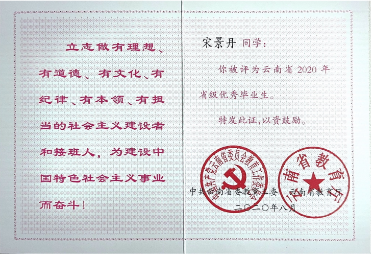 云南省“优秀毕业生、优秀学生干部、励志奖学金”、校级“三好学生、优秀共青团干部、优秀工作者”等荣誉,组团参加的第五届互联网+大学生创新创业大赛获省级银奖。