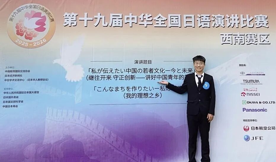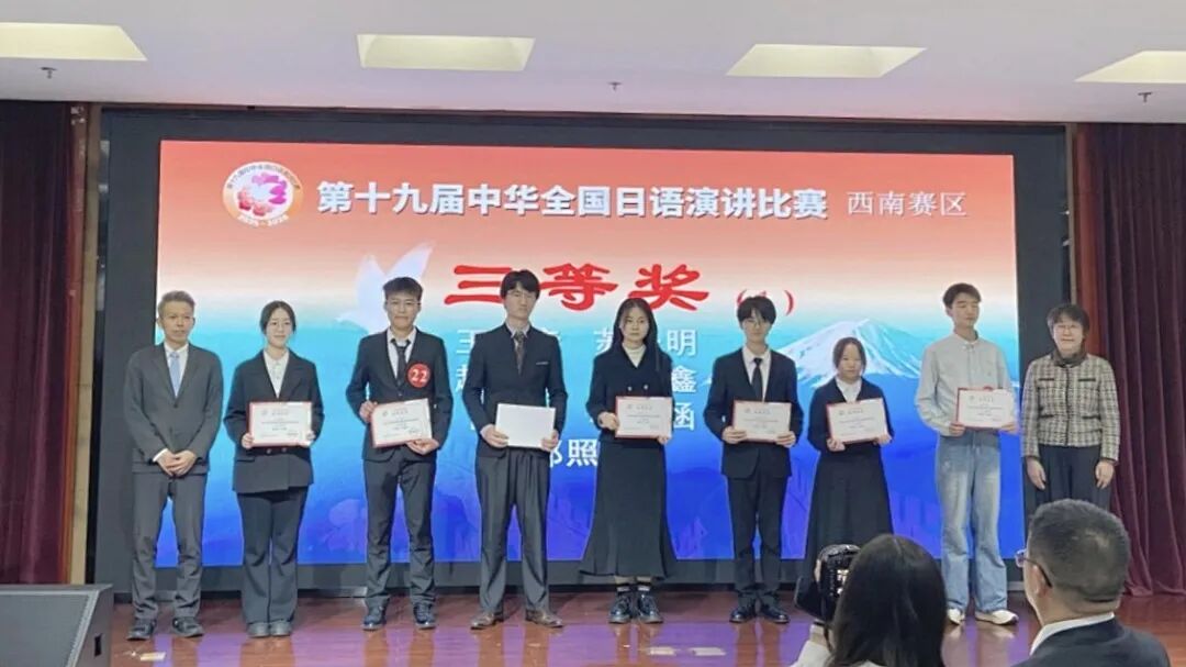 2025年10月25日,第十九届中华全国日语演讲比赛(西南赛区)在西南大学落下帷幕。本次比赛由西安外国语大学研究生院院长、博士生导师毋育新教授担任评委会主任,共有来自西南地区30所高校的选手进行角逐,我校日语专业三年级学生苏子明同学通过校赛选拔,反复锤炼,凭借平时的不懈努力,在比赛中取得优异成绩,在云南省参赛的5所院校中排名第二,最终斩获三等奖。
