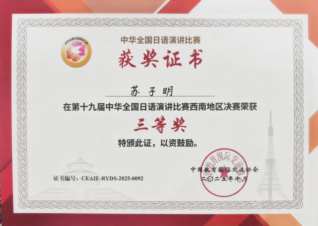 比赛当天,面对强劲的竞争对手,苏子明沉着应战。在命题演讲中,他以流利的日语和生动的案例,向评委展现了当代中国青年的文化自信;在即兴演讲环节,他围绕“AI与人情味”展开论述,逻辑清晰,表达流畅,最终荣获三等奖。