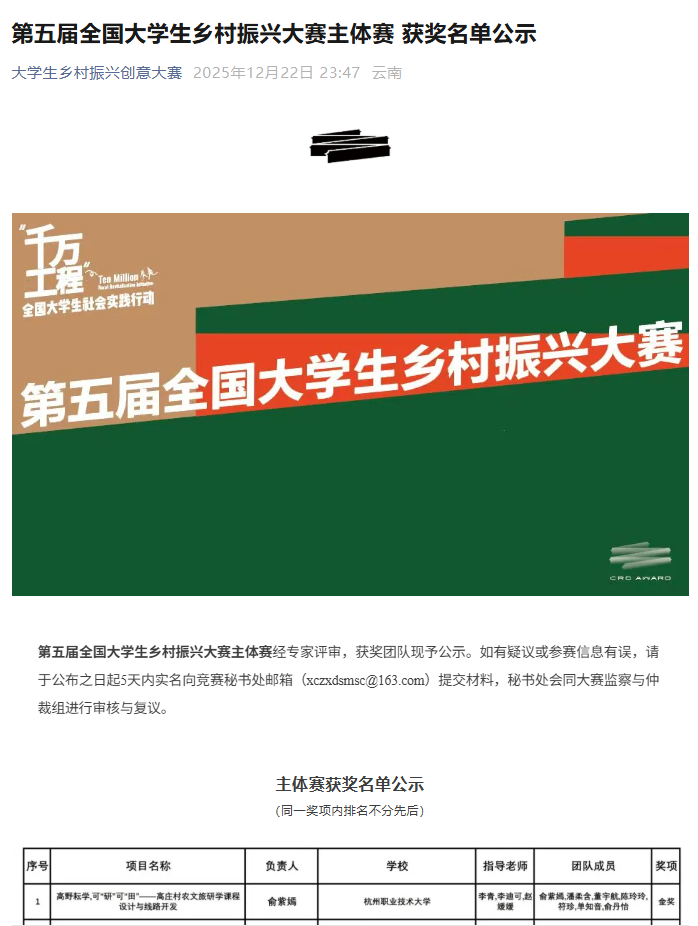 近日,第五届全国大学生乡村振兴大赛主体赛决赛在浙江大学圆满落幕。我校选派的学生参赛团队凭借扎根乡土的实践探索、兼具创新与实效的优质方案,在全国近600所高校1200余个参赛项目中脱颖而出,成功斩获国家级银奖。这一成绩不仅实现了我校在该项赛事上的零突破,更彰显出我校学子服务国家乡村振兴战略的责任担当与过硬专业素养。