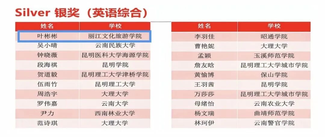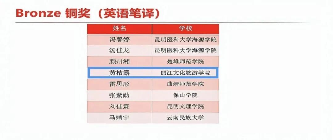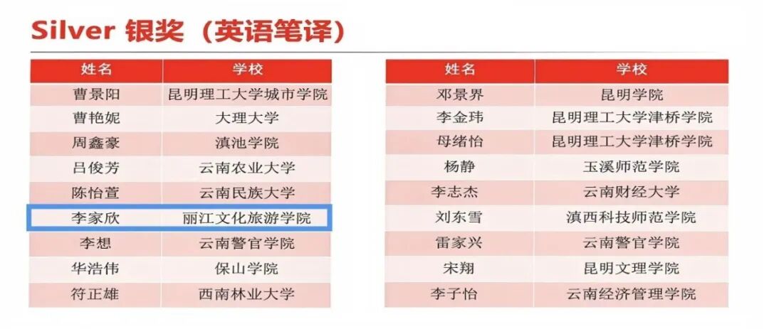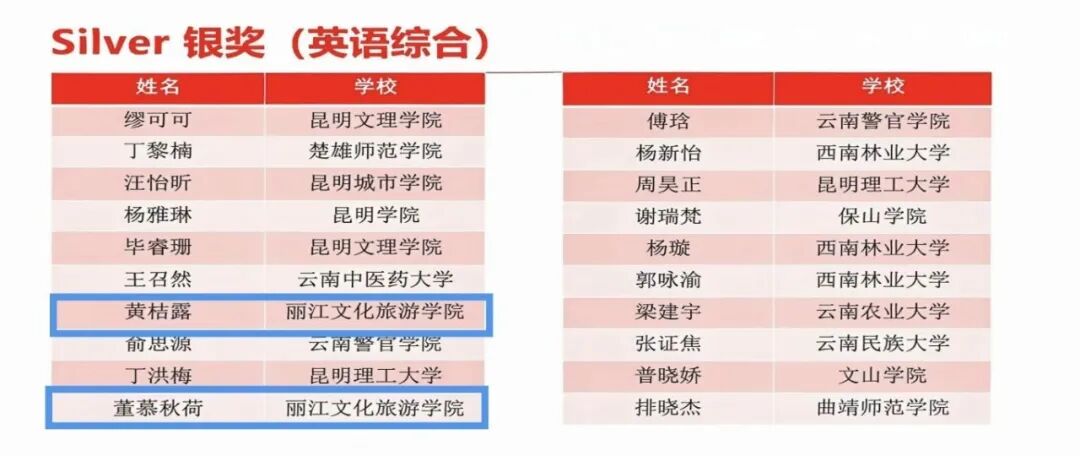 丽江文化旅游学院在此次比赛中表现突出。在英语演讲环节,由郑会莹老师指导的李可同学在省级复赛中,与全省其他高校包括博士生、硕士生在内的81位优秀学子同台竞技,凭借出色发挥,成功晋级决赛阶段,最终获英语组演讲赛银奖;由赵丽媛、杨莹老师指导的李圣同学获英语组演讲赛铜奖,展现了学校在外语实践教学中的扎实功底。