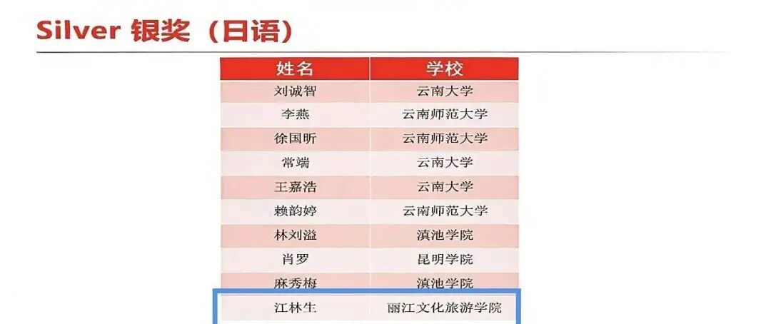 此外,本赛事其他赛项的云南赛区决赛也在前期完成,我校学子表现同样不凡:叶彬彬、董慕秋荷、黄桔露获英语组综合能力赛项银奖,王美林获铜奖;李家欣获英语组笔译赛项银奖,黄桔露获笔译赛项铜奖;江林生获日语组银奖,游伟奕、冯鹏举、苏子明获日语组铜奖。多项荣誉的取得,体现了学校在外语人才培养方面的综合实力与持续突破。
